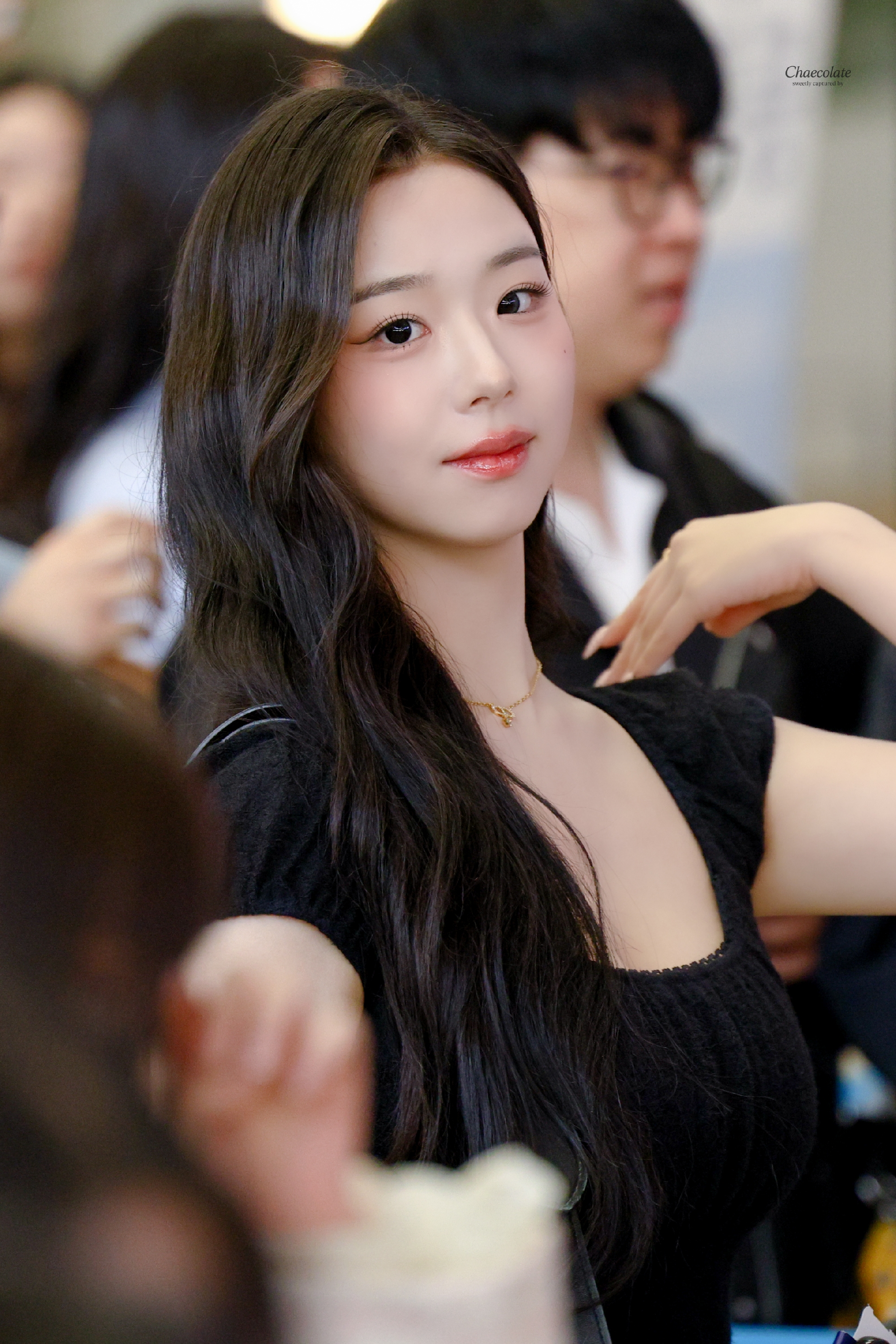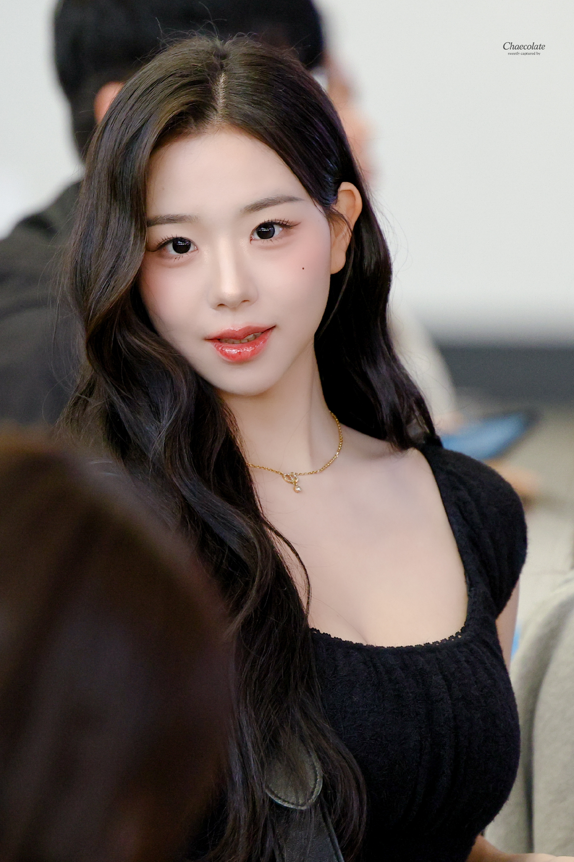 가슴골 노출이 신경 쓰이는듯한 김채연 검정 셔링 U넥 티셔츠