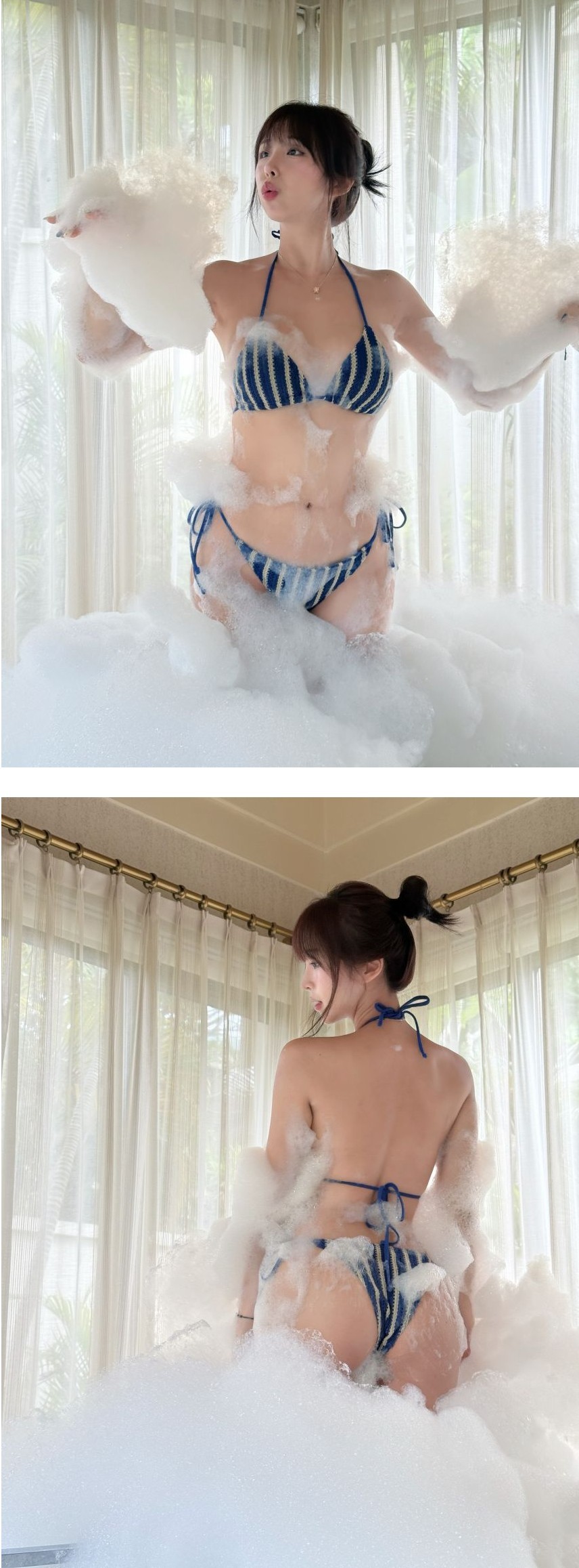파란 줄무늬 끈비키니 입고 거품 목욕하는 유부녀 꽃빵