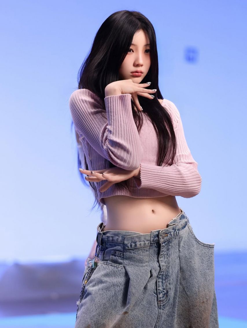 아일릿 원희 핑크색 골지 크롭티 귀여운 복부 배꼽 까꿍