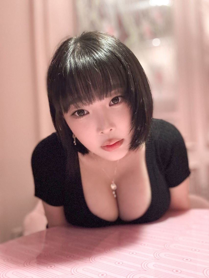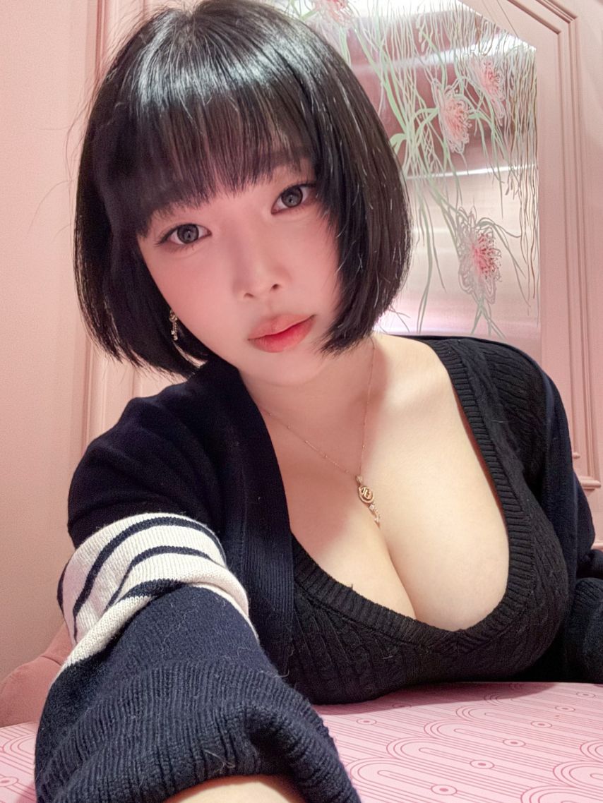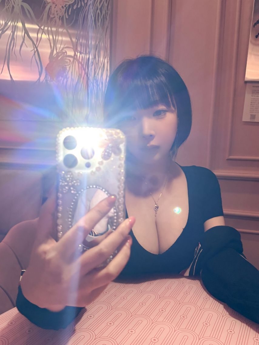 검정 꽈배기 니트 미드 가슴골 테이블에 올려놓은 강인경