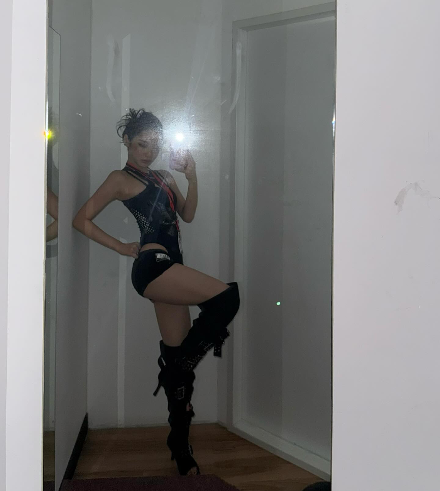 거의 수영복 수준의 에스파 닝닝 블랙의상 가슴골 거울 셀카