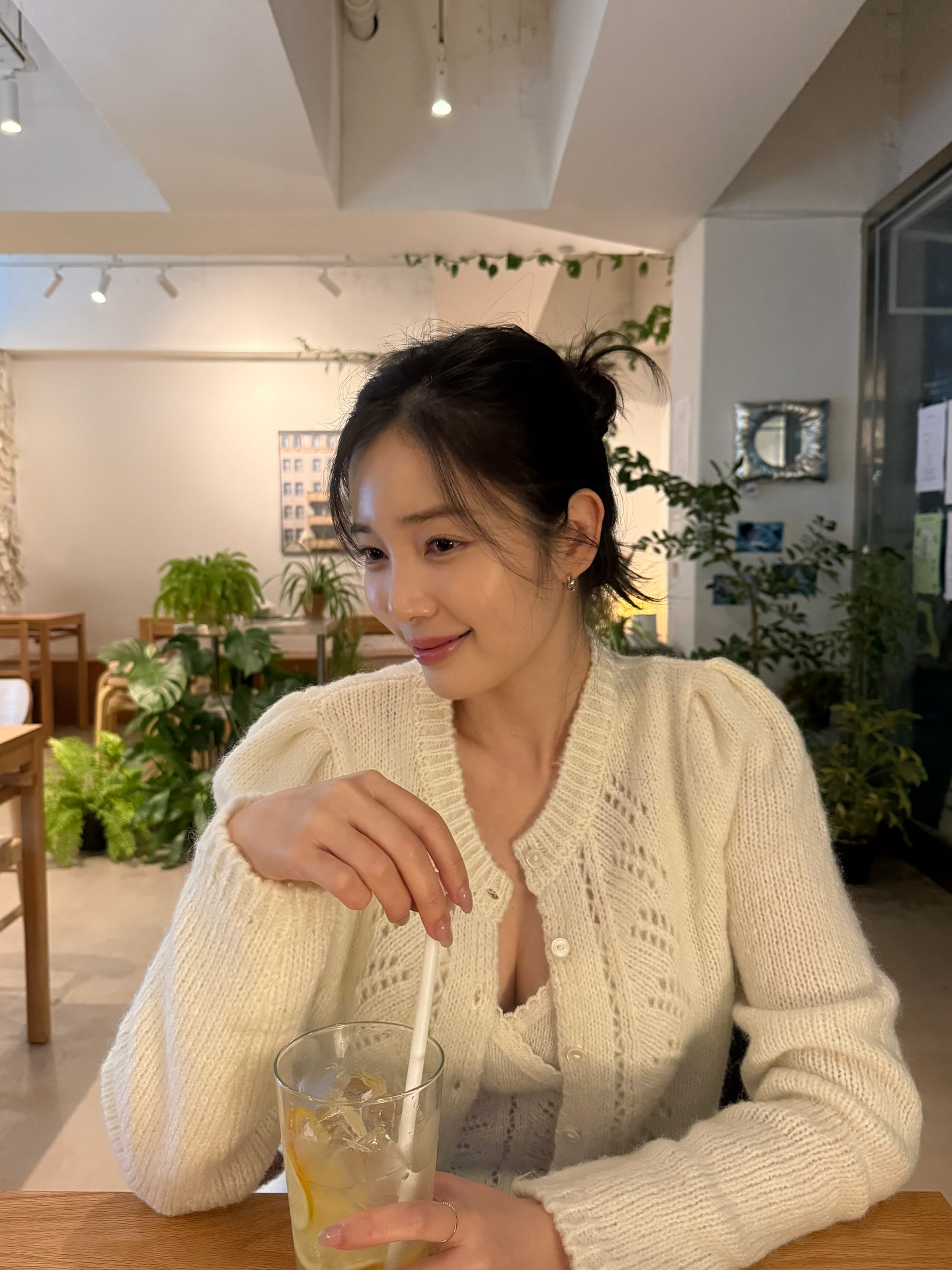 레몬티 마시는 에이프릴 윤채경 흰 가디건 속 아찔한 가슴골
