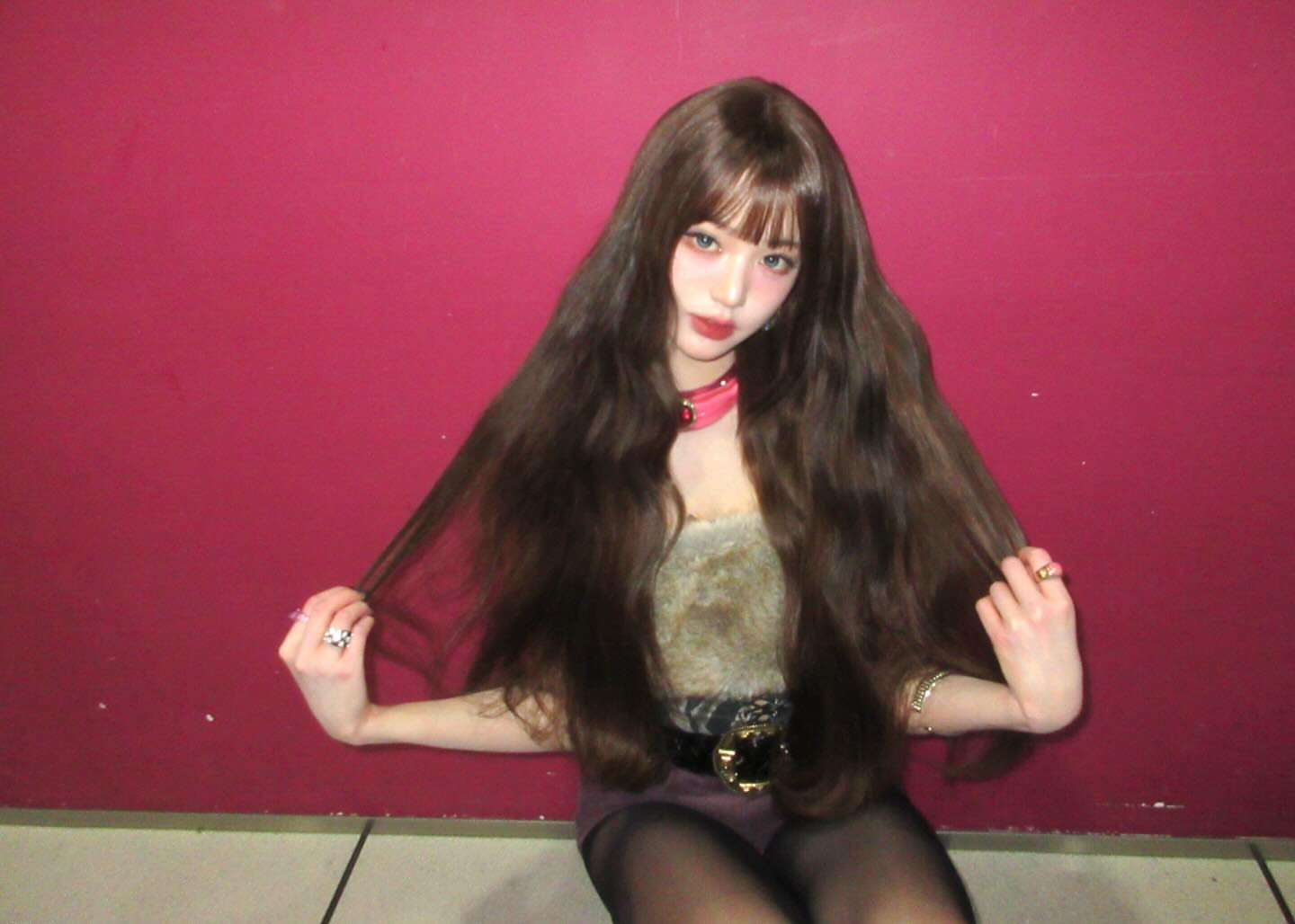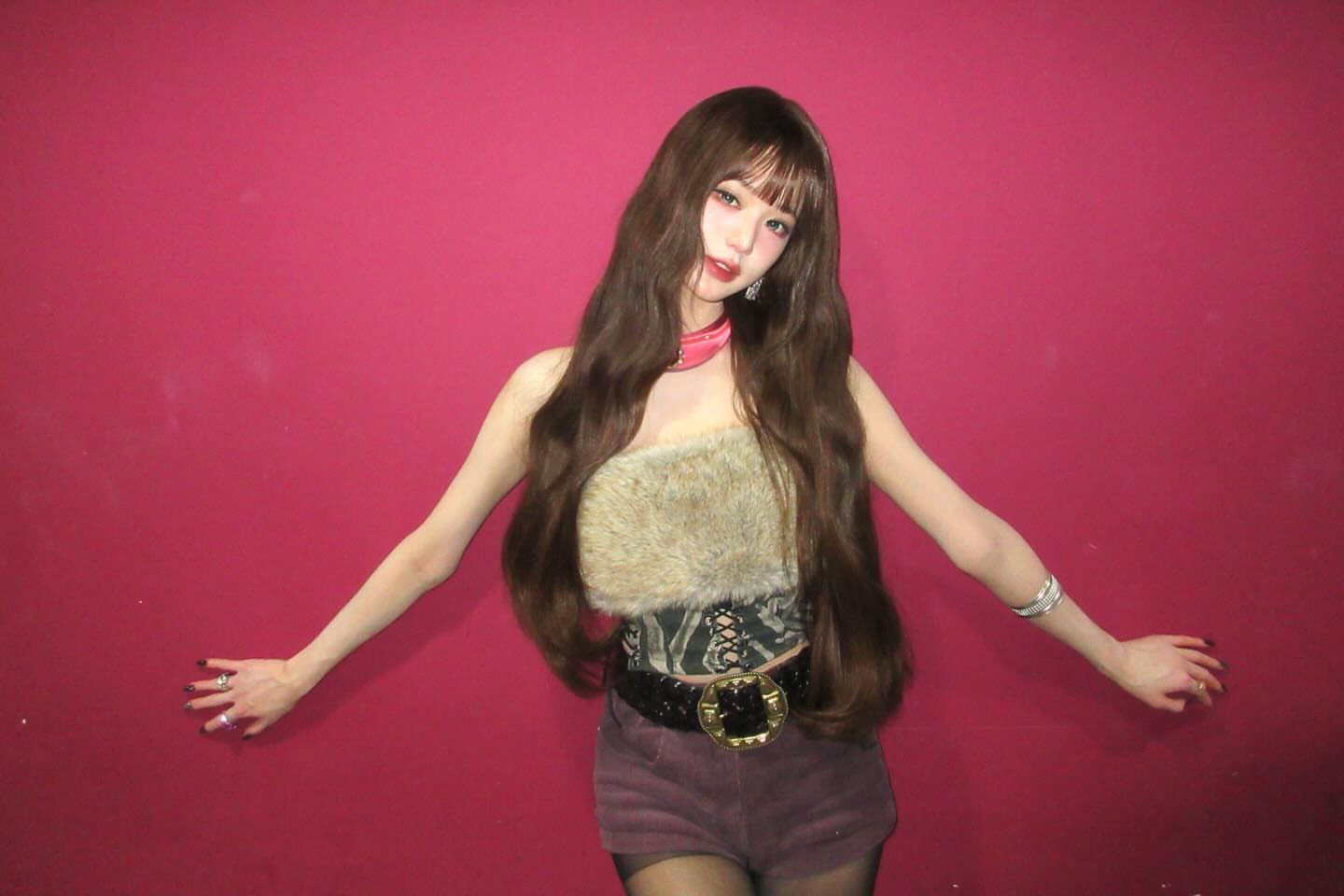 장원영 늑대털 튜브탑 가슴골 + 보라색 핫팬츠 검스 허벅지
